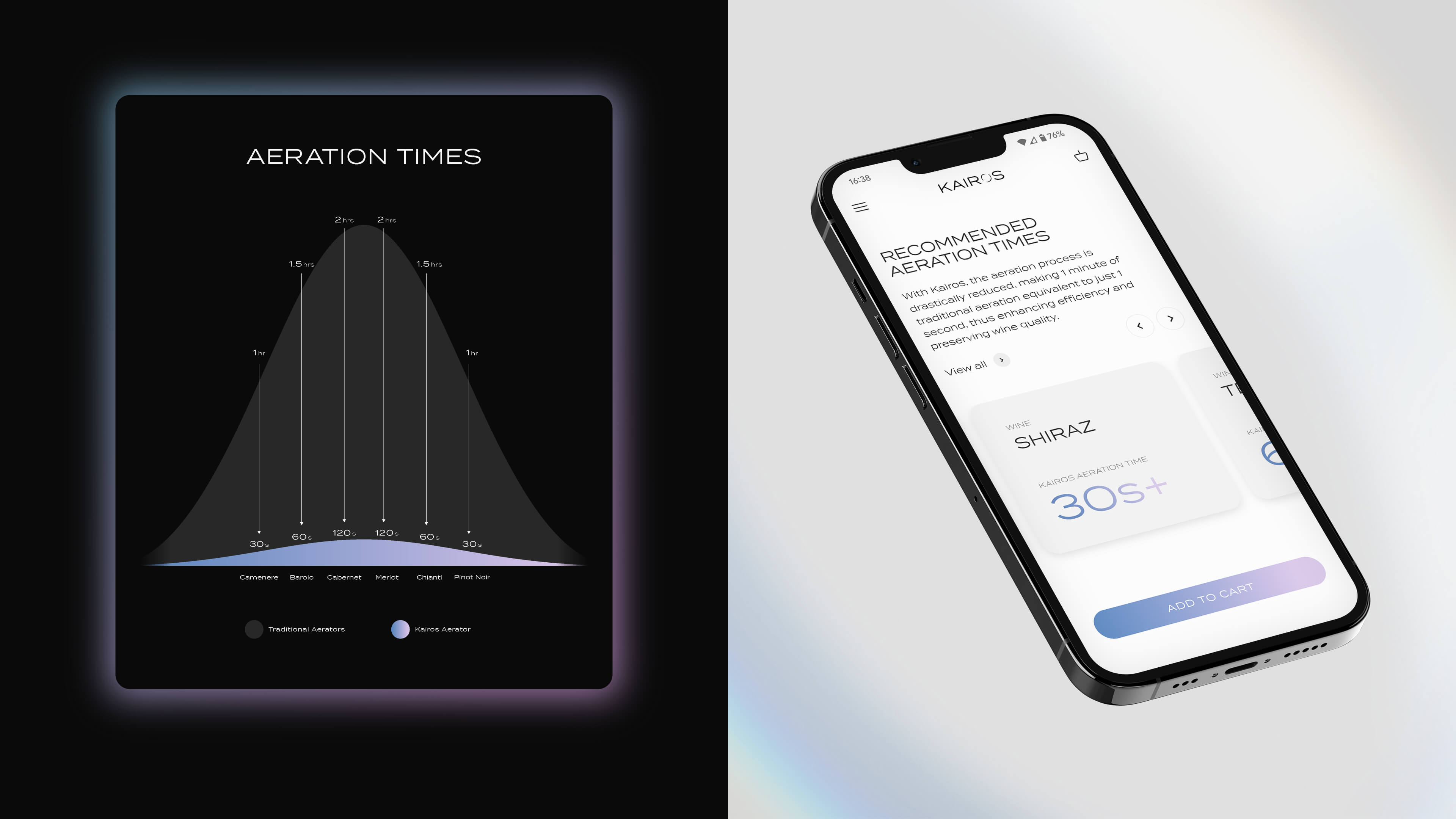 Kairos is an innovative new breakthrough in wine aeration technology. The first aerator of its kind, it uses electromagnetic wave technology to aerate wine completely contactlessly. What’s even more impressive is that it achieves in seconds what traditionally takes hours. The team that developed the product approached us with a prototype and a bold ambition – to take their wine aerator to the world of wine service, globally.
